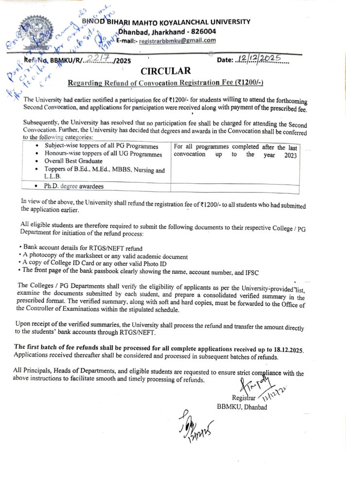 BBMKU का बड़ा फैसला: दीक्षांत समारोह पंजीकरण शुल्क ₹1200 होगा वापस