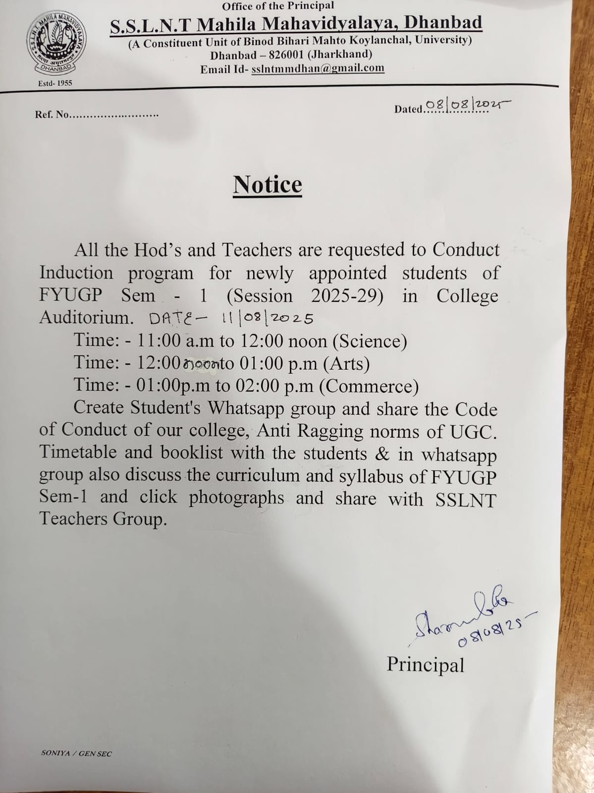 एसएसएलएनटी महिला महाविद्यालय में FYUGP सत्र 2025-29 के नवप्रवेशित छात्रों के लिए 11 अगस्त को होगा इंडक्शन प्रोग्राम !
