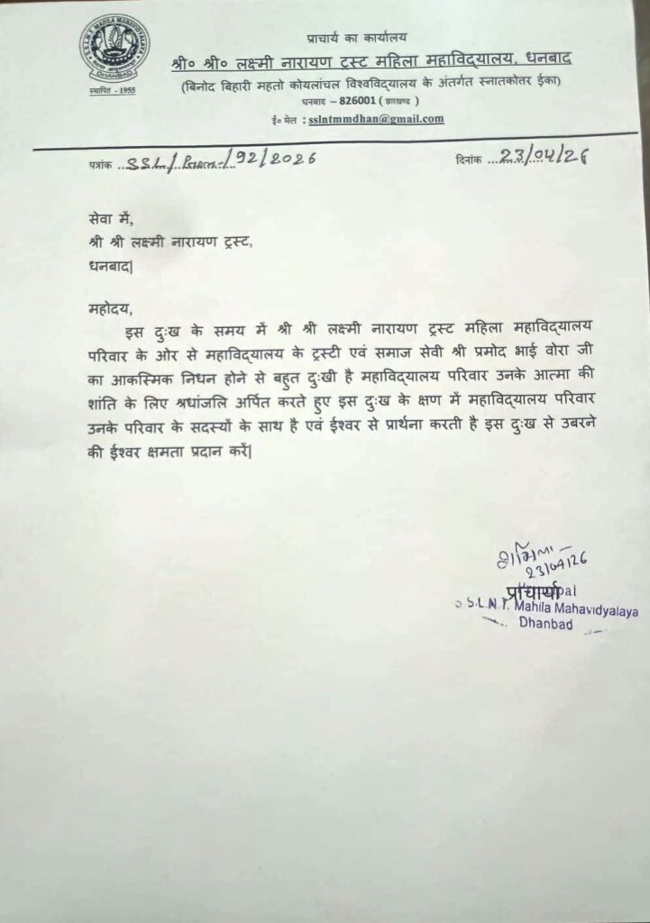प्रमोद भाई बोरा के निधन पर श्री लक्ष्मी नारायण ट्रस्ट महिला महाविद्यालय ने जताया शोक !
