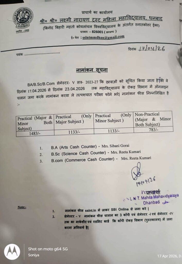 एसएसएलएनटी महिला महाविद्यालय में सेमेस्टर-V नामांकन की सूचना जारी, 23 अप्रैल तक फीस जमा करने का निर्देश !